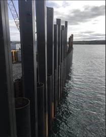 Open cut trenching will be used from the toe of the rock revetment across the intertidal area to connect with the offshore export cables (diagram of area shared below). To replicated the function of the coastal defence (preventing flood risk) and to maintain a dry working area when the ducts are being installed, a cofferdam is required to be installed. The cofferdam is a steel u-shaped structure which will surround the working area and is created by installing individual sheet piles using vibro-piling in the intertidal area. The cofferdam will consist of a double wall – outer and inner. The total length of the sheet piling required to form the cofferdam will be around 135m and the height of the cofferdam will be the equivalent of the top of the existing revetment therefore providing robust mitigation of the potential risk of flooding (example picture of a cofferdam below).